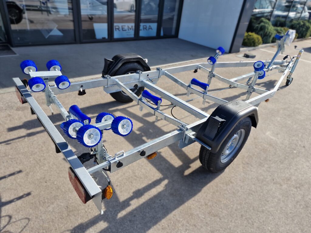 Prikolica za plovila BA 1300R z lastno težo 304 kg in širino skoraj 2 m je odlična izbira za uporabnike, ki potrebujejo več stabilnosti in prostora. Robustna konstrukcija omogoča varen transport srednje velikih plovil do približno 5,8 m dolžine, tudi pri pogostejši uporabi.